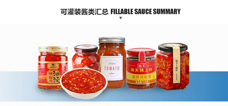 醬類灌裝旋蓋一體機(jī)采用活塞式伺服驅(qū)動(dòng)原理,適用于調(diào)味品中的醬料,濃湯或者帶顆粒并且濃度較大的辣椒醬、豆瓣醬、花生醬、芝麻醬、果醬、濃醬、蜂蜜等較為粘稠醬類的灌裝,自動(dòng)化程度高,機(jī)器能完成自動(dòng)灌裝、自動(dòng)取蓋上蓋,自動(dòng)真空封蓋封口。