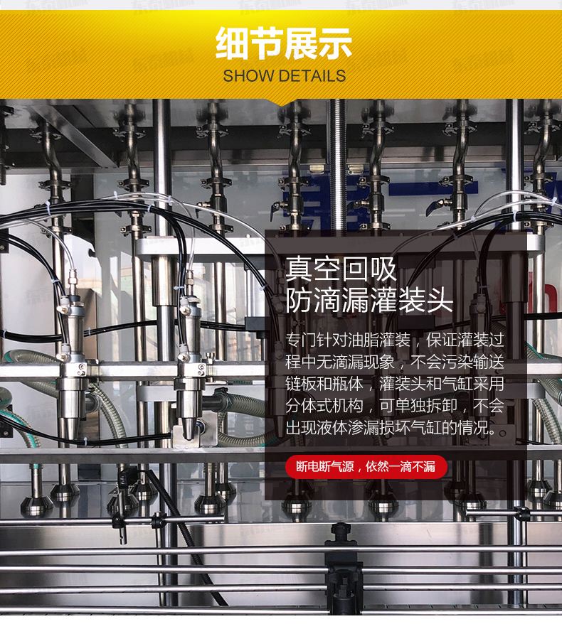 2、設(shè)計(jì)及真空回吸系統(tǒng)保證灌裝過程中無滴漏現(xiàn)象,不會(huì)污染輸送鏈板和瓶體。灌裝頭和氣缸采用分體式機(jī)構(gòu),可單獨(dú)拆卸,不會(huì)出現(xiàn)液體滲漏損壞氣缸的情況。亞德客氣缸經(jīng)久耐用,其他密封等配件使用標(biāo)準(zhǔn)件,更換維護(hù)簡單方便。