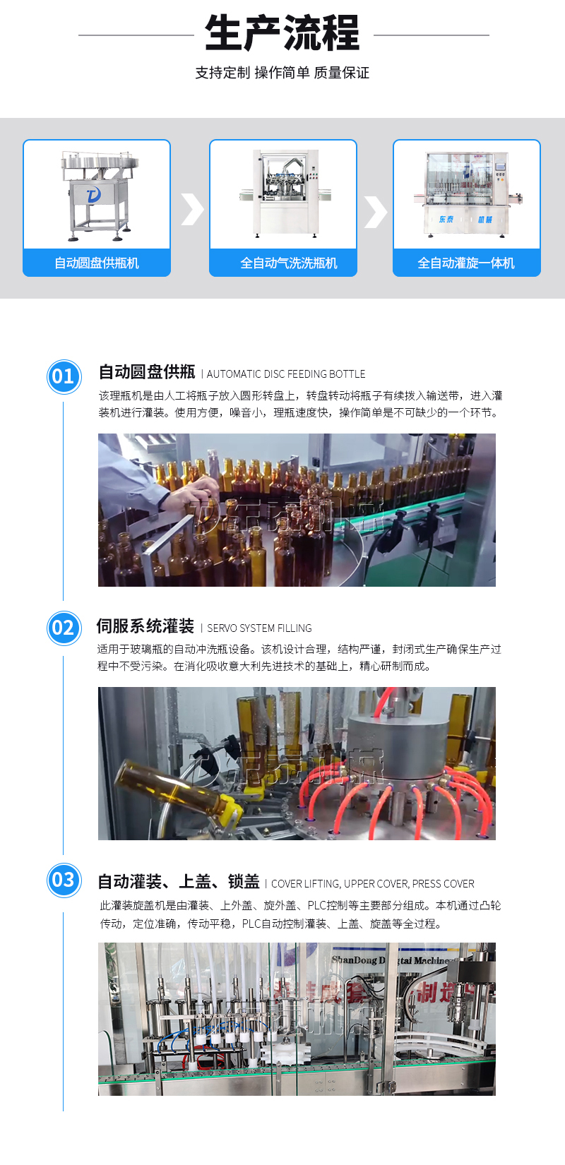此橄欖油灌裝旋蓋機(jī)生產(chǎn)線是由灌裝、上外蓋、旋外蓋、PLC控制等主要部分組成。本機(jī)通過凸輪傳動(dòng),定位準(zhǔn)確,傳動(dòng)平穩(wěn),PLC自動(dòng)控制灌裝、上蓋、旋蓋等全過程。并可配置全自動(dòng)注塑機(jī),由吹瓶直接進(jìn)入灌裝系統(tǒng),防止交叉感染,整個(gè)過程全部在無菌條件下完成,無需洗瓶和烘干。此灌裝旋蓋機(jī)適合于食用油、藥品等粘流體的灌裝生產(chǎn)。
